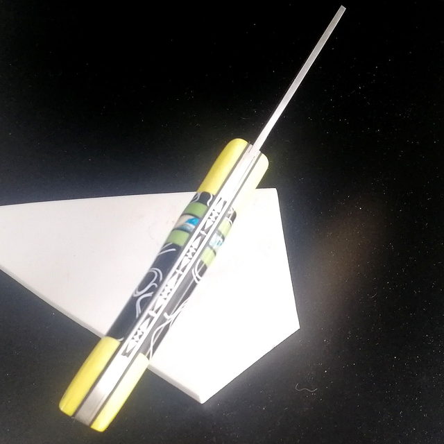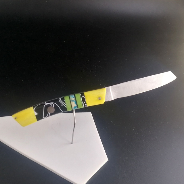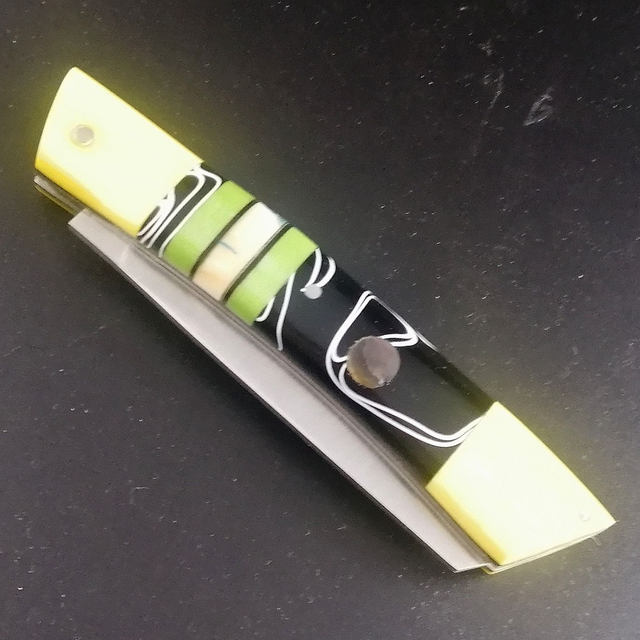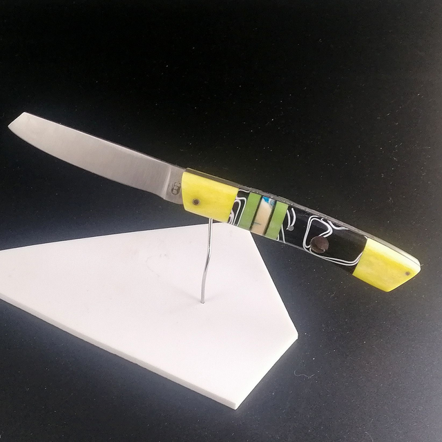 os de chameau teinté jaune, acrylique strié noir, Micarta anis, molaire de mammouth teinté turquoisesur un intercalaire de G10 noir